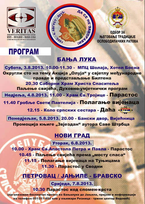 - 04. Августа Парастос се такође одржава у Бања Луци у цркви Св. Тројице, послије којег ће делегација наших породица положити вијенце на споменик страдалим Крајишницима.