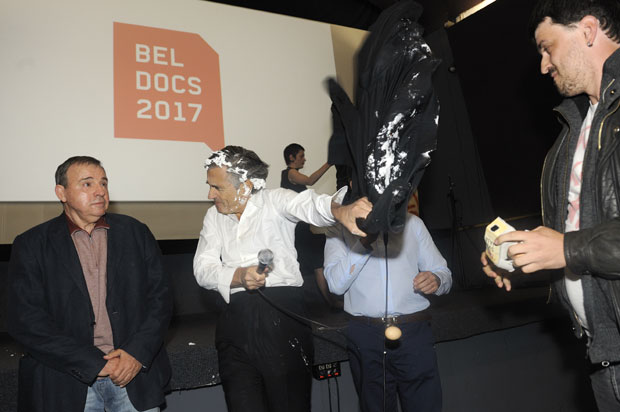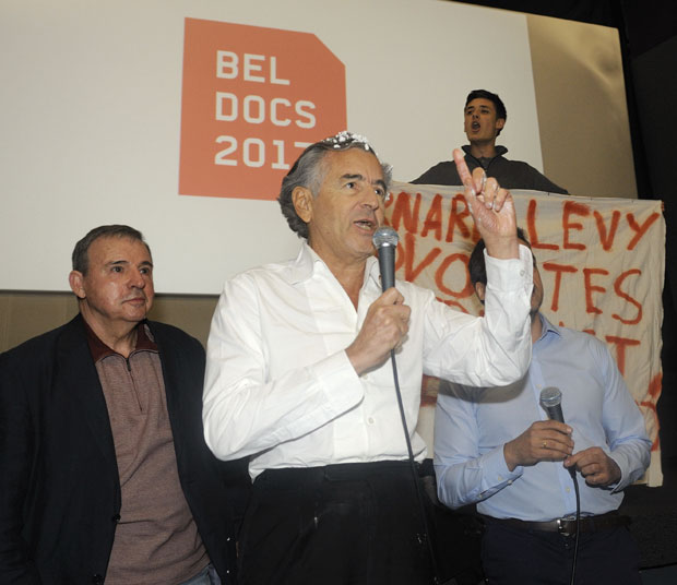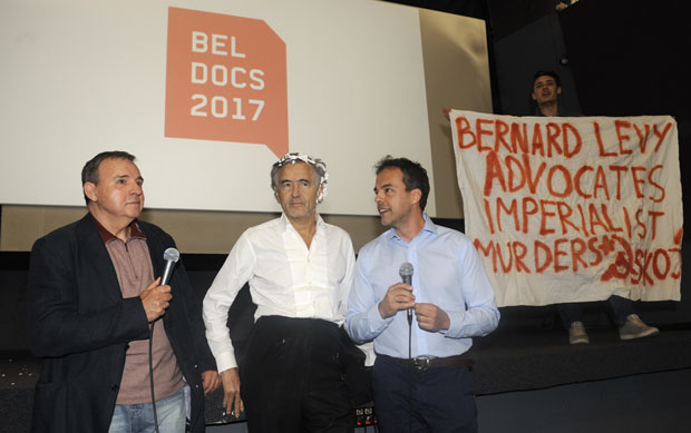 Покушавајући да покаже да га то, ипак, није претерано збунило (комадима торте често га гађају и у Француској, што је постало део „перформанса“ који прати његове наступе), БХЛ је још неколико тренутака имао прилику да говори о филму, а онда се на бини појавио младић са транспарентом „Леви је империјалиста и фашиста“. Испод транспарента био је знак срп и чекић и потпис СКЈ.